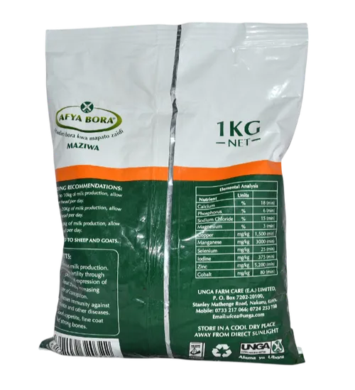 Afya Bora Maziwa is a mineral and vitamin supplement designed to boost milk production and improve overall health in dairy cattle.
