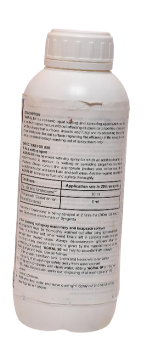 Agral 90 is a non-ionic liquid, wetting and spreading agent which can be mixed with any spray without affecting its chemical properties. It aids the wetting of waxy leaf surfaces, insects and fungi and by spreading the spray more evenly over the leaf surface and hence improving the efficacy of the spray.