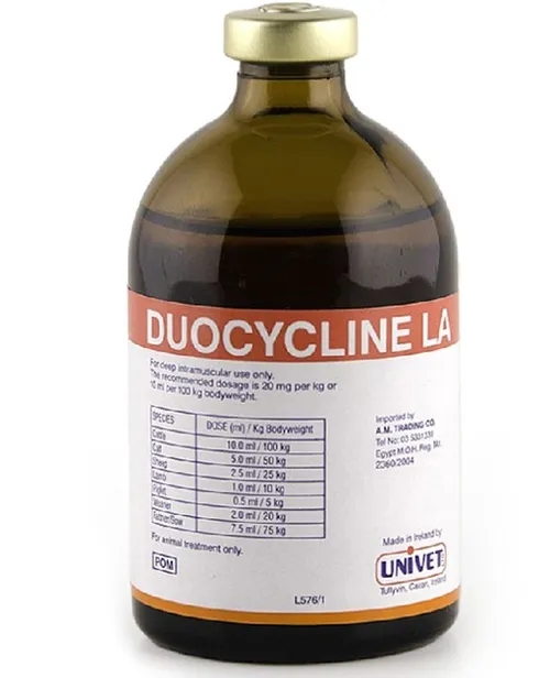 Duocycline 10% Injection is a broad-spectrum antibiotic used in livestock to treat bacterial infections caused by organisms susceptible to oxytetracycline, the active ingredient.